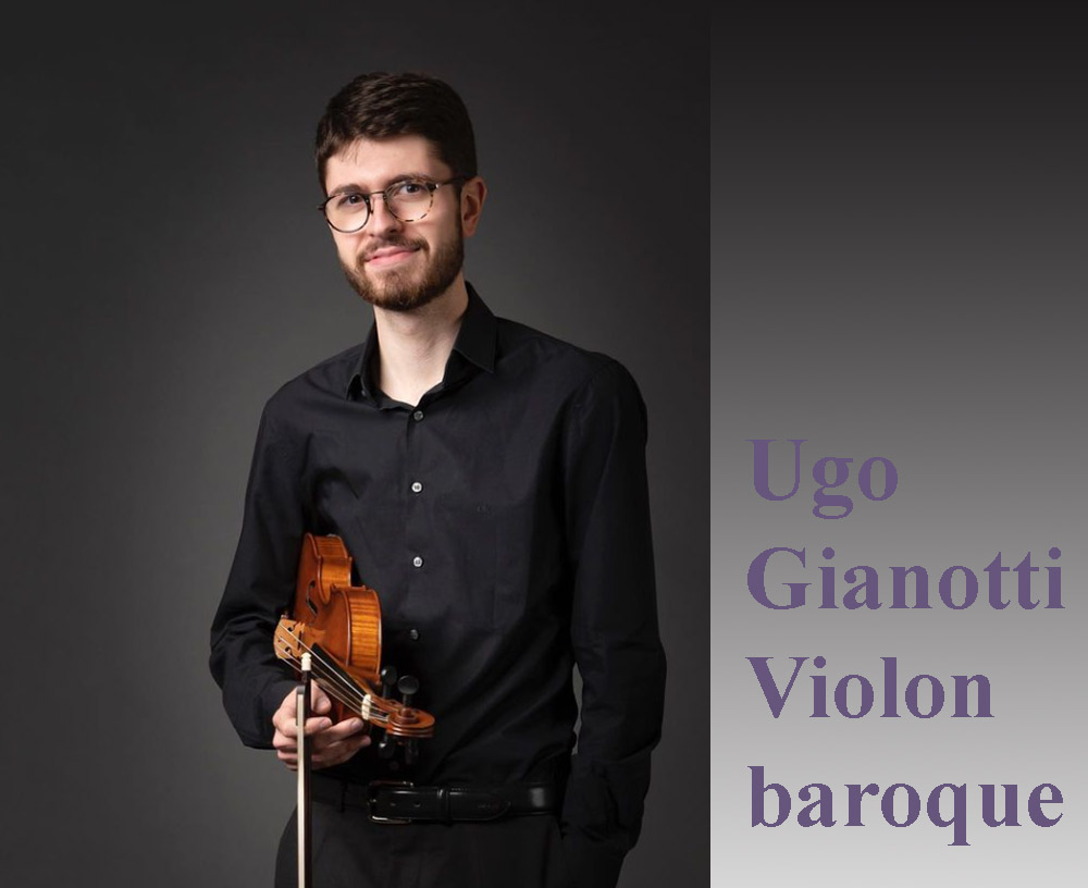 - Ugo Gianotti : Ugo a grandi dans un univers musical. Après des études de violon moderne, il choisit de se tourner vers la musique ancienne et le violon baroque. Après deux stages à Thoiry dans le cadre de « Brillamment baroque », il approfondit la pratique de l’instrument ancien avec Frédéric Martin à Dijon puis au Pôle Supérieur de Poitiers avec Marie Rouquié. Il intègre en 2019 le CNSMD de Lyon dans la classe d’Odile Edouard.