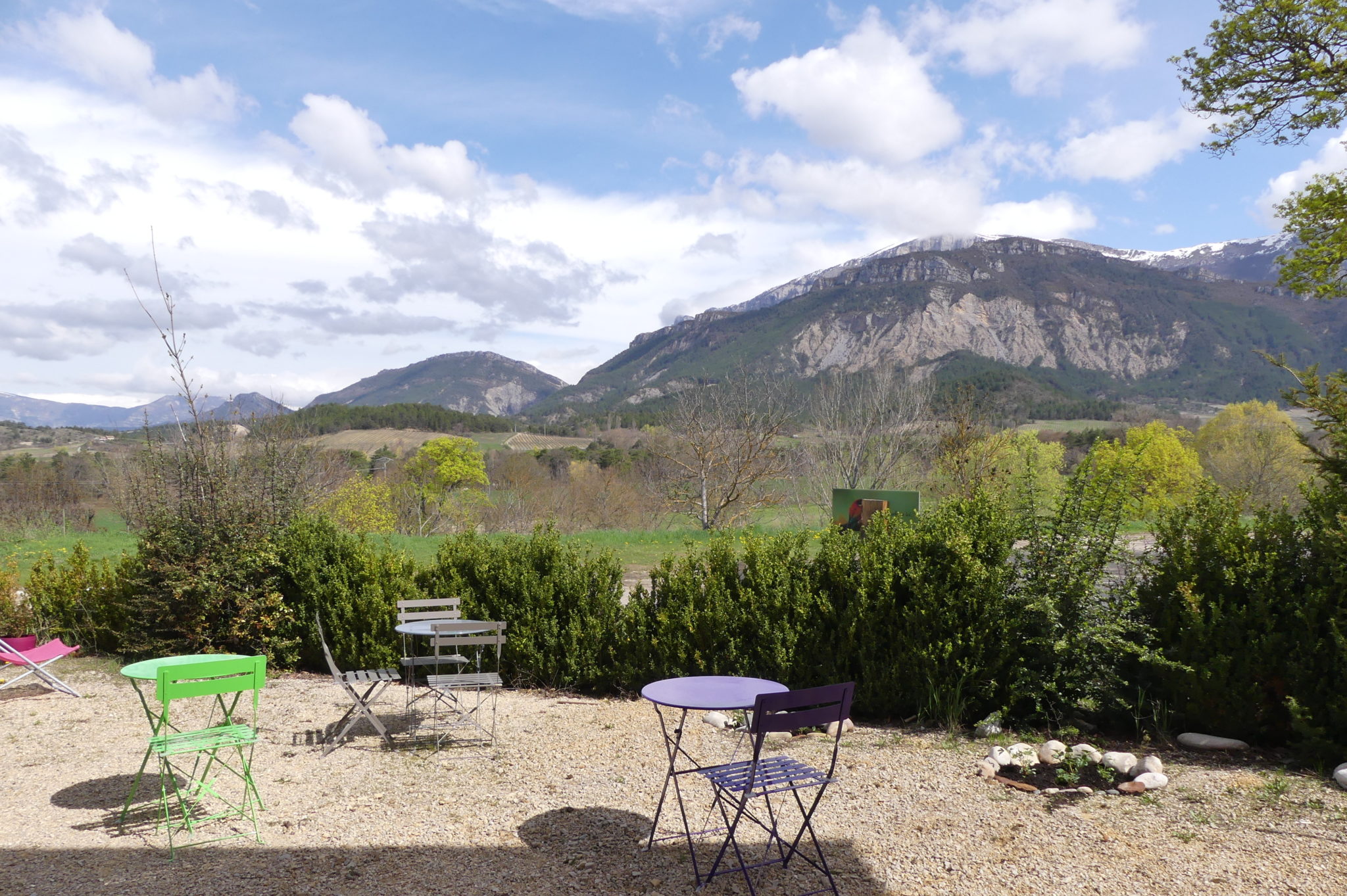 – salon et terrasse extérieure donnant sur les magnifiques paysages des contreforts du Vercors