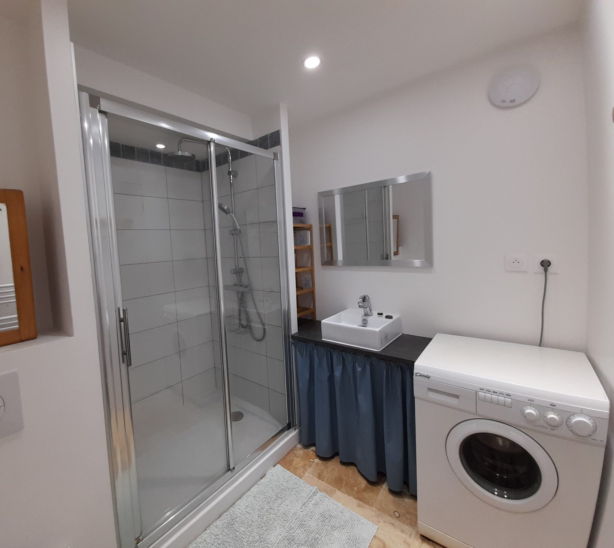 Une belle salle d'eau / WC avec une grande cabine de douche et machine à laver le linge.