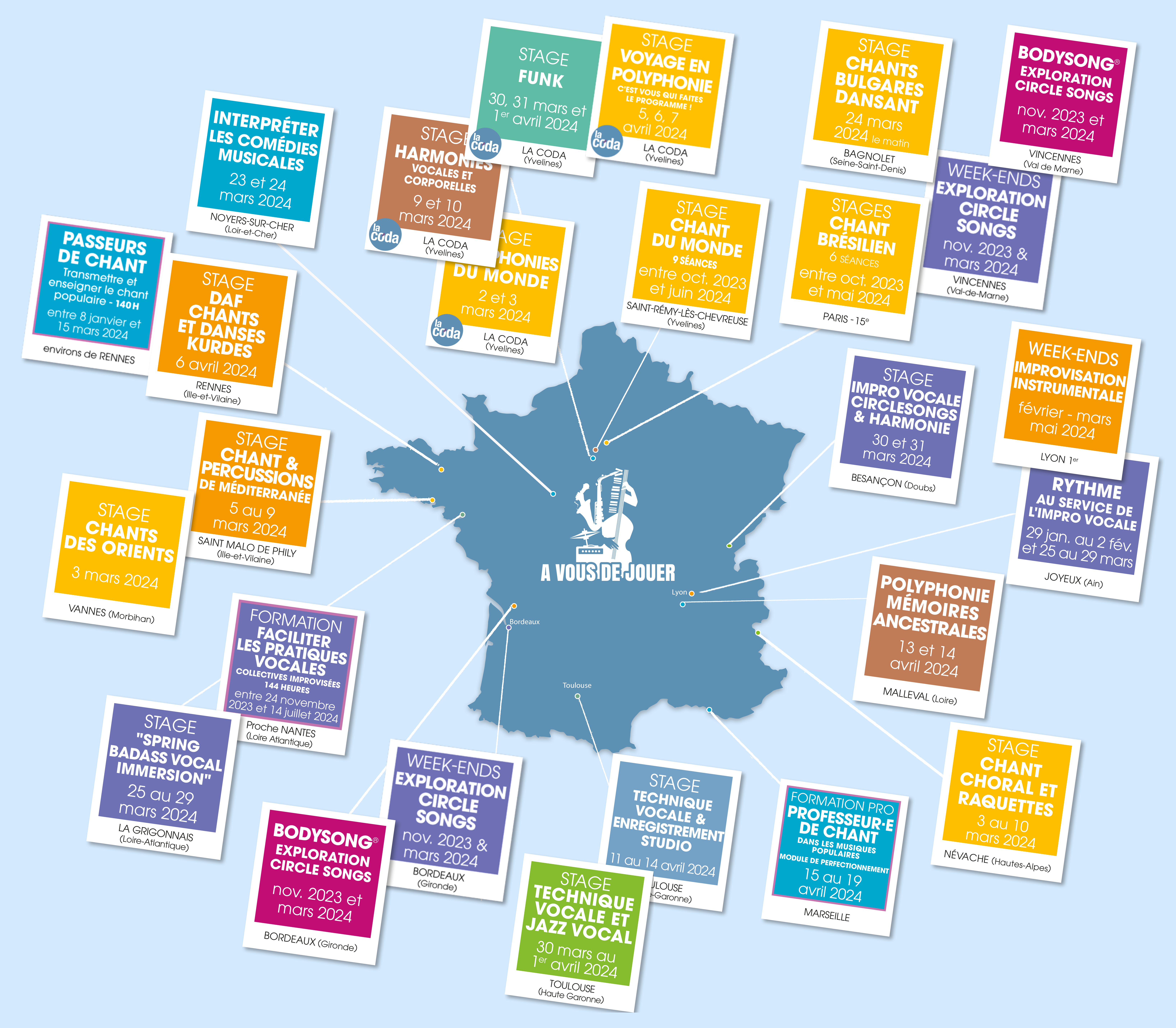 Le stage Chant et Randonnée sera le seul rendez-vous ouvert à toutes et tous. Les autres s’adressent aux vocalistes expérimenté·es et peuvent faire l’objet d’une prise en charge au titre de la formation professionnelle (Afdas, Uniformation, FIFPL…). Notez un Labo Vocal supplémentaire au printemps et comme d’habitude, celui du mois d’août coanimé avec Pierrick Hardy. Les inscriptions pour la promotion Passeur·euses de chant de l’automne 2024 seront bientôt ouvertes…