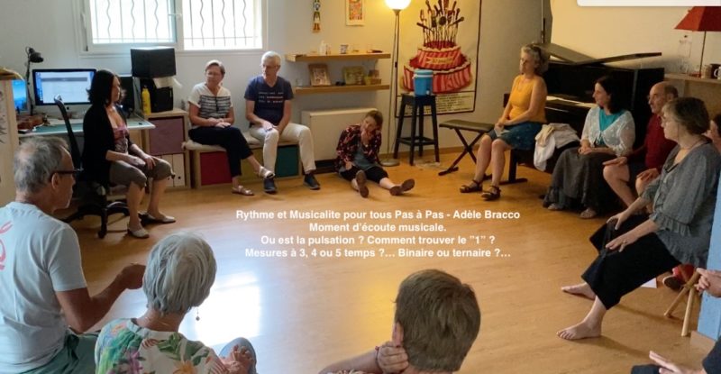 Il y aura un avant et un après stage "Pas à pas" ! Moi qui me suis toujours sentie "analphabète" face à la musique, j'ai enfin compris des concepts restés jusque là très flous parce qu'Adèle nous les a présentés et fait expérimenter activement via des canaux diversifiés : écoute, verbalisation, motricité, représentation graphique, appui sur le groupe. Chacun est amené à travailler à son niveau, avec pour objectifs la conscience, la justesse et l'autonomie dans ses réalisations. Je sais maintenant comment ne plus avoir à compter sur mes voisins pour démarrer au bon moment! Le travail est exigeant, très énergétivore en terme de concentration, tout en restant ludique et en étant toujours mené avec bienveillance. Je repars avec un entraînement conséquent à mettre en œuvre, soutenue par le plaisir ressenti lorsque les difficultés s'effacent et que les frappes commencent à sonner juste ! Merci Adèle !