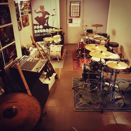 Matériel mis à disposition : le local est équipé d'une salle de practice-pads dédiée au travail des rudiments et d'une salle de cours insonorisée équipée de deux à quatre batteries, d'une sono, d'un piano et de plusieurs amplis.